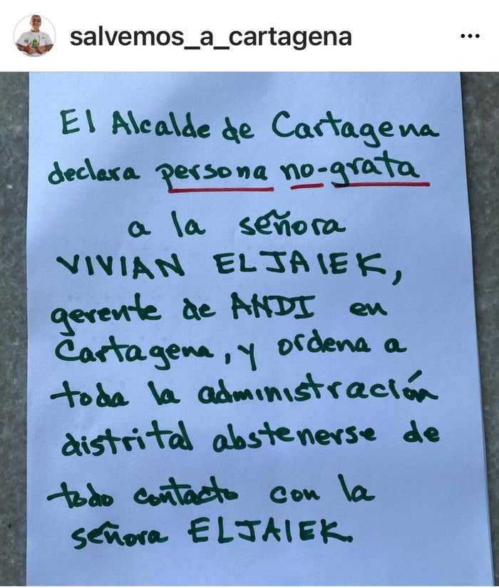 “El alcalde de Cartagena no se llama Bruce Mac Master, ni Vivian Eljaiek. El alcalde de Cartagena declara persona no grata a Vivian Eljaiek, gerente de ANDI en Cartagena, y ordena a toda la administración distrital abstenerse de todo contacto con la señora Eljaiek”, dice la publicación.
