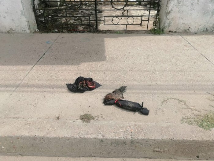 Miren lo que hallaron en el campo santo: un cuervo muerto dentro de una berenjena cubierto con una tela negra; una gallina sin cabeza, y como ñapa, un paquete del que nadie le quiere meter mano.