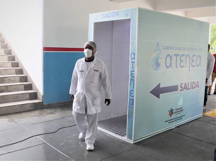 Esta cabina, compuesta por 16 aspersores nebulizadores, fue elaborada con materiales de fácil limpieza y, según sus diseñadores, posee un sensor de movimiento para evitar cualquier contacto que pueda ser transmisor del virus.