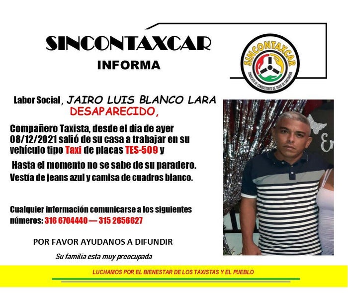 “Labor social está desaparecido el compañero Jairo Luis Blanco Lara, desde el día 8 de diciembre salió de su casa a trabajar en su vehículo y hasta el momento no se sabe de su paradero”, detalla el aviso del gremio de taxis.