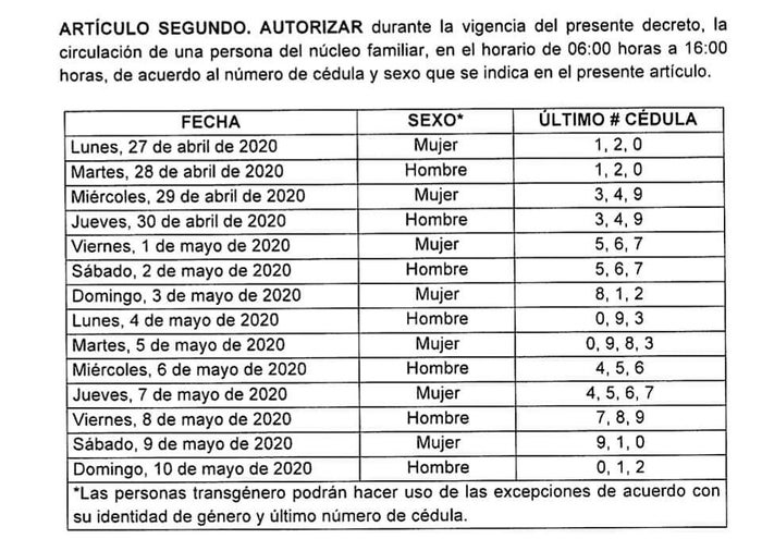 El nuevo decreto no cambia la reglas del anterior. Un solo miembro de la familia puede salir de sus viviendas a comprar los insumos básicos de la canasta familiar,teniendo en cuenta el último dígito de su cédula y si es hombre o mujer.