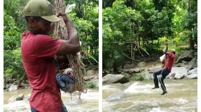 En un video que circula en diferentes redes sociales, quedó captado el momento en que la población indígena Chimila, ubicada en la zona rural de Santa Marta, pone en riesgo su vida al cruzar el río Gaira colgados en una cuerda, por falta de un puente peatonal exponen la vida de los bebés indígenas.