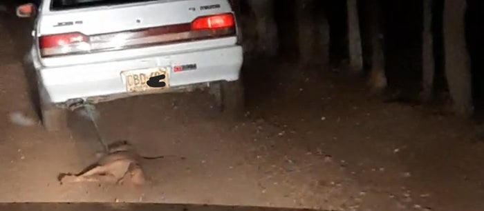 La denuncia fue realizada por un labriego del sector que se movilizaba en una motocicleta quienes grabaron a parte del recorrido del carro Mazda blanco que llevaba al perro arrastrando.