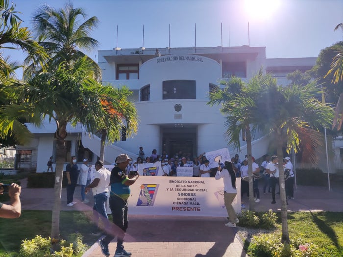 “¡Que nos paguen!” gritan con arengas los trabajadores del hospital, en las puertas del edificio de la gobernación del Magdalena.