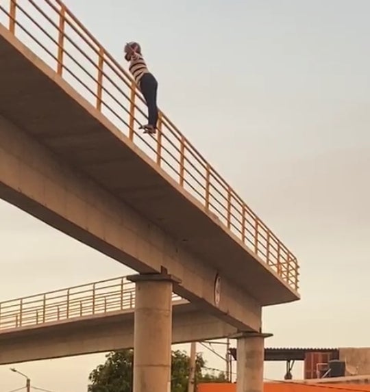 Lo curioso del caso es que la joven, de acuerdo al registro de vídeo en redes sociales, decidió lanzarse de la estructura con un casco en su cabeza, el cual traía puesto luego de bajarse de una moto en el lugar de los acontecimientos.