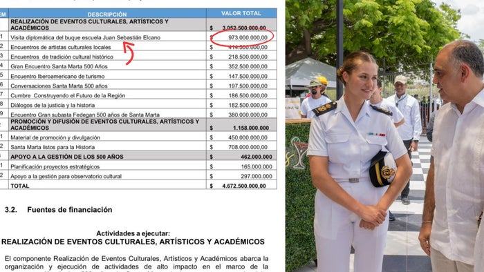 El millonario monto hace parte del presupuesto general de $4.672 millones asignado a un proyecto de la Secretaría de Cultura Distrital, cuyo objetivo es "fortalecer y proyectar a Santa Marta como epicentro cultural, artístico y turístico". Dentro de este rubro se incluyó específicamente la visita diplomática del buque escuela Juan Sebastián Elcano y la llegada oficial de la heredera al trono del Reino de España, en un acto cargado de simbolismo histórico y diplomático.