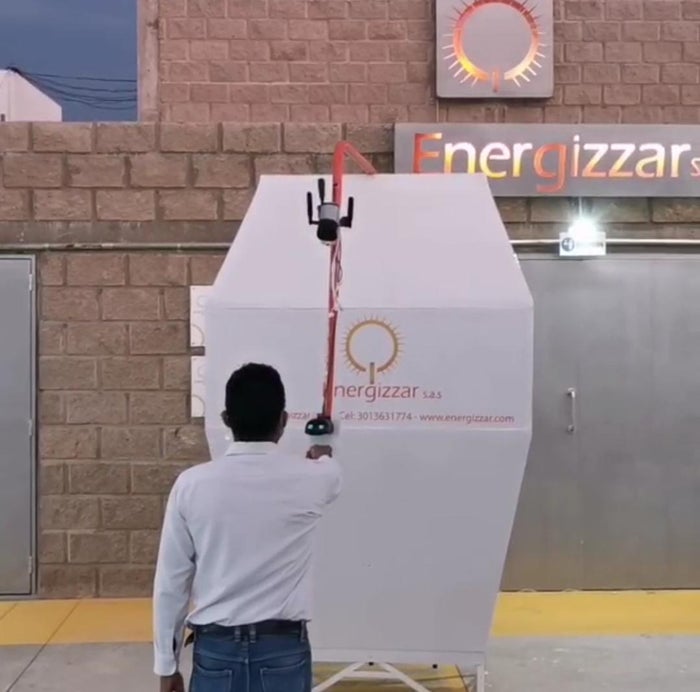 Al mejor estilo internacional, esta empresa montó un prototipo criollo de control de transeúntes, el cual está implementando en los aeropuertos internacionales como China y otros países donde se reactivaron los vuelos, a escala local, la máquina toma la temperatura y a la vez por lector de código de barra puede identificar a la persona de una manera muy rápida y sin complicaciones.