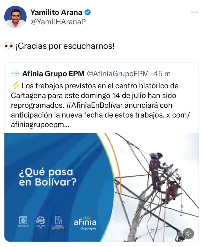 La empresa contestó este viernes con el siguiente texto: “Los trabajos previstos en el centro histórico de Cartagena para este domingo 14 de julio han sido reprogramados. #AfiniaEnBolívar anunciará con anticipación la nueva fecha de estos trabajos”.