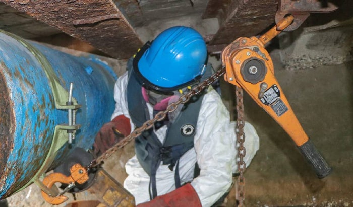 Informan que los trabajos empezaron a las 6:00 a. m., y que ha sido difícil por las limitaciones e incomodidad del lugar, el cual se encuentra a escasos 50 centímetros sobre el agua, por lo que la empresa diseñó una estructura de andamiaje adecuada a las condiciones existentes, que incluye un sistema de flotabilidad para realizar las labores con seguridad y facilitar el retiro e instalación del tramo de tubería de 30 pulgadas de diámetro.