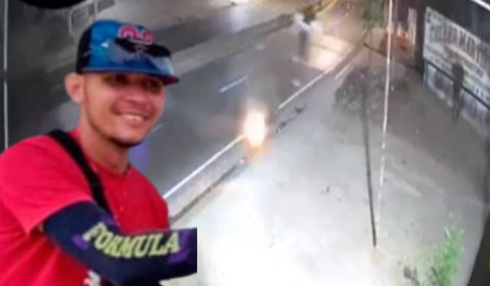 En la imagen se observa cuando el hombre de nacionalidad venezolana, identificado como Grey José Medina Teherán, de 25 años conduce aparentemente a alta velocidad cuando en milésimas de segundos pierde el control de la moto y sale disparado cayendo de forma aparatosa.