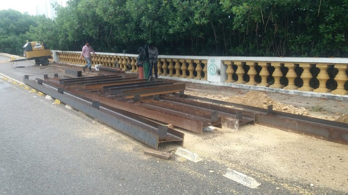 "Desde que se firmó el acta de inicio comenzó la construcción de las vigas en concreto en los extremos del puente, donde se apoyará la estructura metálica, y las cuales ya fueron fundidas. Estos elementos son transportados desde el interior del país y una vez en el sitio se iniciaron labores de corte, soldadura y ensamblaje para la posterior instalación de la lámina de rodadura por donde transitaran los vehículos”, indicó el funcionario.