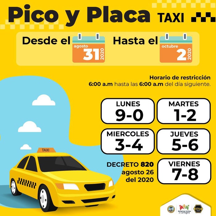 Según quedó establecido en el decreto 820 del 26 de agosto de 2020, la circulación de taxi estará restringida desde el día 31 de agosto de 2020, hasta el 27 de agosto de 2021, en el horario comprendido entre las 6:00 a.m., y las 6:00 a.m., del día siguiente, de lunes a viernes, en todas las vías de la ciudad de Cartagena, de acuerdo con el último dígito de placa.