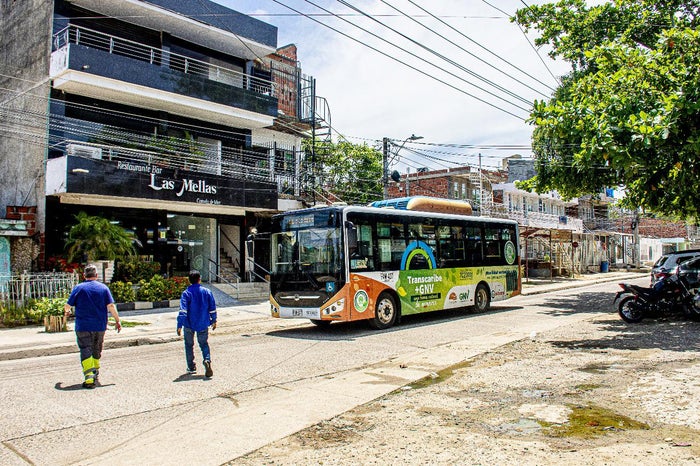 El Ecobús Piloto de Transcaribe opera con gas natural vehicular (GNV) y está equipado con tecnología de seguridad, puertos USB y sistemas de información para los pasajeros, alineándose con los estándares de sostenibilidad ambiental del sistema.