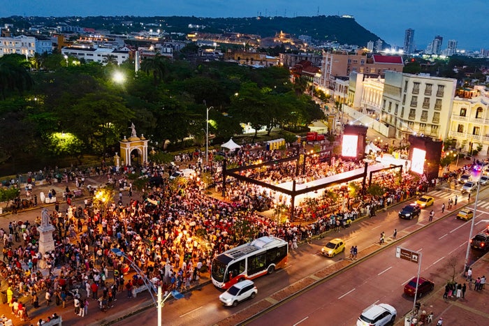 El componente musical inició con la emotiva interpretación del himno de Cartagena a cargo de la reconocida artista Cenelia Alcázar, acompañada en el piano por el maestro Edgar Avilán. Más tarde, la agrupación Bazurto All Starspuso a corear a la multitud sus éxitos “El Bololó”, “La Muchachita” y “La Manguera”, mientras que Juan Carlos Coronel, quien celebra 50 años de trayectoria, rindió homenaje a su ciudad con “Mi Tierra” y anunció una nueva canción dedicada a la heroica urbe. Entre cada bloque, el set del DJ Fetcho mantenía el ambiente festivo con champeta, salsa y música novembrina.